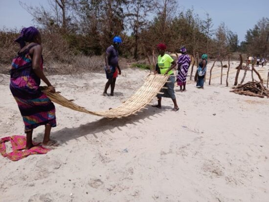 Par ailleurs, des épis Maltais renforcés de fascines ont été mis en place pour lutter contre l’érosion côtière et l’avancée du trait de côte. Ces ouvrages permettent de réduire et de dissiper la force des vagues, ce qui favorise le dépôt de sédiments entraînant la formation d’un cordon dunaire pour la stabilisation des sédiments et la protection durable du littoral. Ils créent également des conditions favorables à la régénération naturelle de la mangrove.