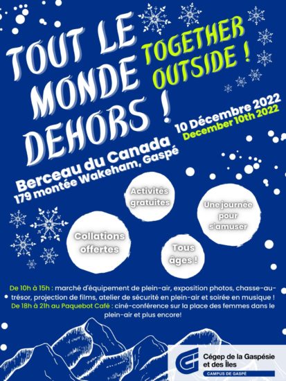 Les finissantes et finissants en techniques de tourisme d’aventure du campus de Gaspé invitent la population à participer à « Tout le monde dehors! /Together Outside! ». Cet événement consacré au plein air se veut accessible, gratuit, agréable et éducatif. Diverses activités seront proposées au Berceau du Canada le samedi 10 décembre de , et la soirée continuera avec une projection de films au Paquebot Café.