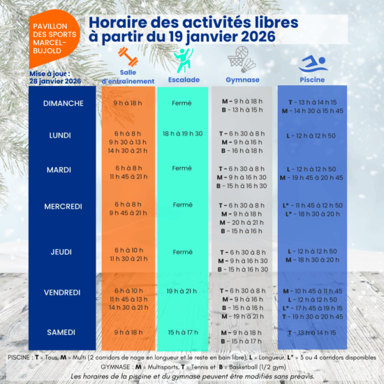 L’horaire est mis à jour fréquemment pour assurer un accès optimal à nos équipements.