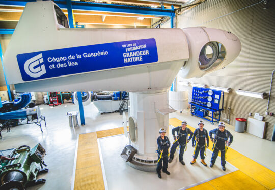 Situé sur notre campus de Gaspé, le Centre québécois de formation en maintenance d’éoliennes (CQFME) dispose d’une vingtaine de stations d’apprentissage, de trois turbines et d’une boîte d’engrenage. La structure principale, en bois, est certifiée LEED (construction durable) et elle utilise un système de chauffage géothermique.